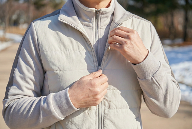 두꺼운 옷 한 벌보다 얇은 옷을 겹쳐 입는 것이 체온 조절에 훨씬 효과적입니다. 운동 중 체온이 오르면 하나씩 벗어 조절하세요.
